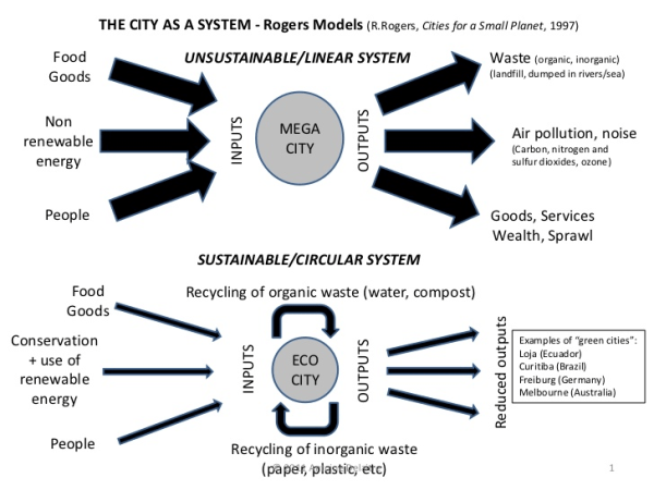 - Linear and circular – or unsustainable and sustainable – models of cities. Source: Rogers, 1997.